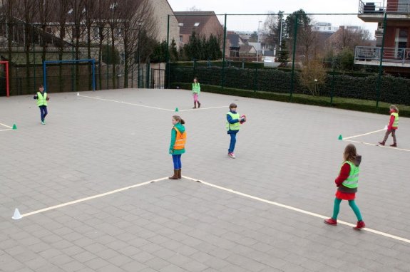 Via verschillende opdrachten leren de kinderen het belang van oogcontact en zichtbaarheid in dodehoeksituaties.
