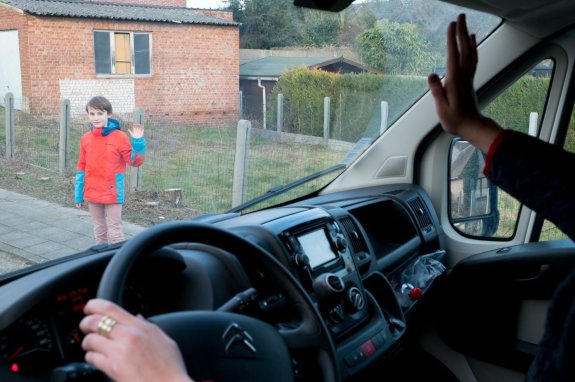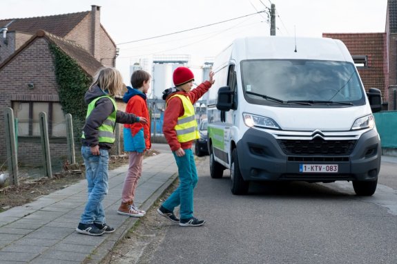 De leerlingen leren waar ze het best kunnen staan op de stoep als er een groot voertuig naast hen staat. Vervolgens focussen we op oogcontact.