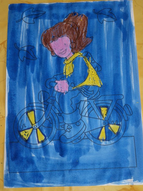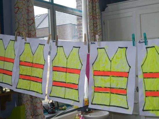 - Verkeerskleurprenten: kinderen kleuren met geel waskrijt over items als hesje, reflecterende band van het wiel. Daarover ga je met blauwe ecoline (tekening wordt donker = 's nachts) en alleen de gele dingen zijn zichtbaar.