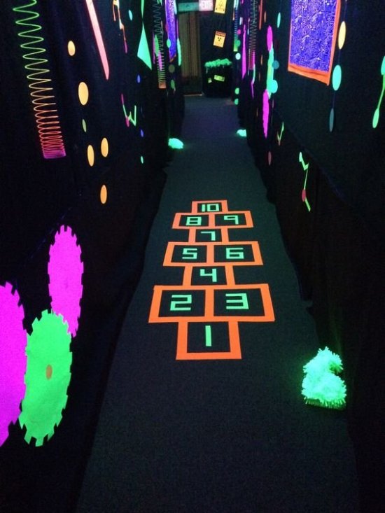 - Een tunnel met blacklights om de school binnen te komen (gemaakt met zwart plastic)