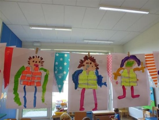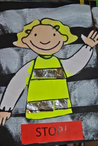 - Knutselen met kleuters: print de prent van 'fluo Jules', laat de kleuters het hesje schilderen met fluoverf (of gele of oranje verf). Maak de reflecterende stroken met snippers zilverpapier. Schilder met witte verf een zebrapad op zwart papier en kleef Jules erop.