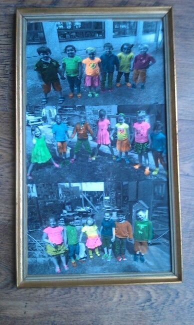- Fluokunst: zwart-witfoto's inkleuren met fluostiften, fluosnippers kleven op zwarte ondergrond en lamineren, stempelen met fluoverf,...