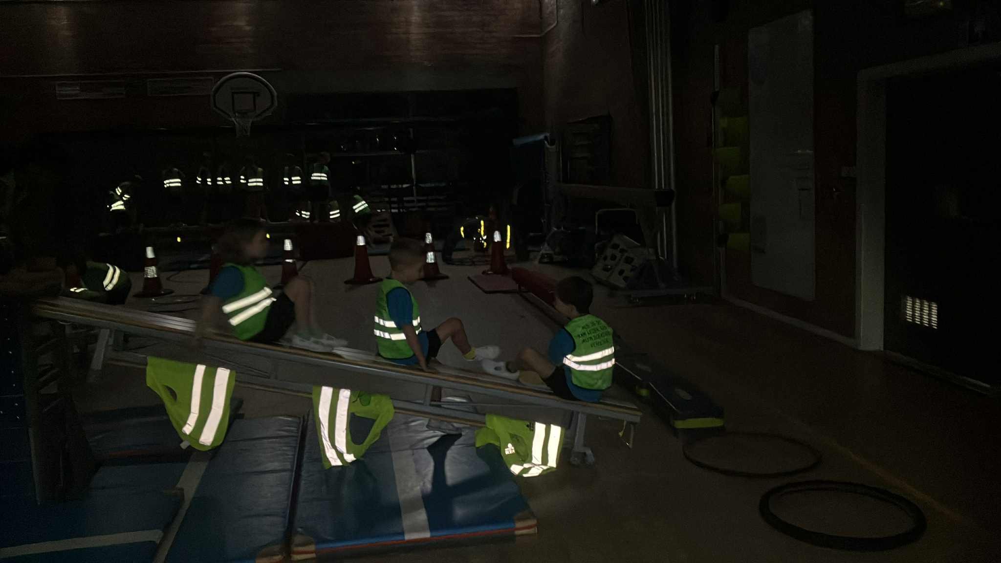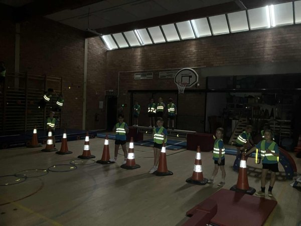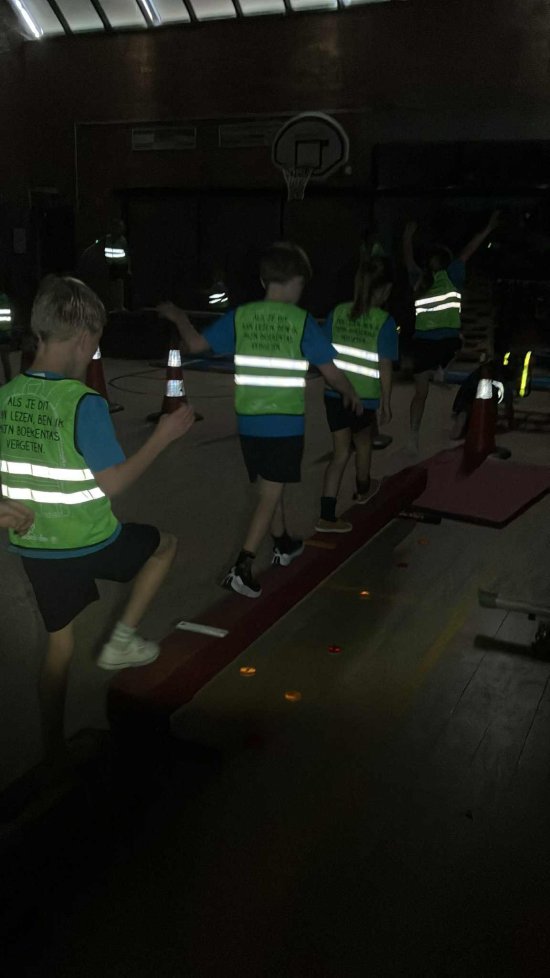 - Een fluoparcours in de turnzaal om het verschil tussen fluo en reflecterend te leren met als eindspel het fietsbelspel: duid in het donker aan vanwaar het geluid van de bel komt.