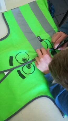 - Een reuzenfluohesje hijsen op de speelplaats (van oude, aan mekaar genaaide hesjes).