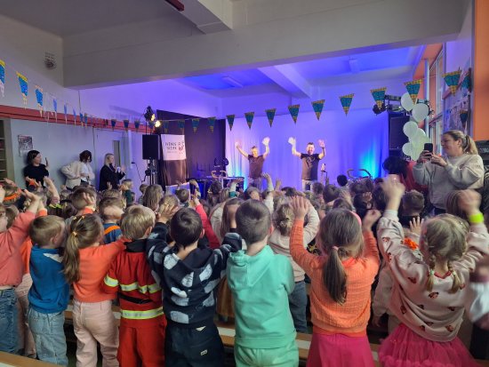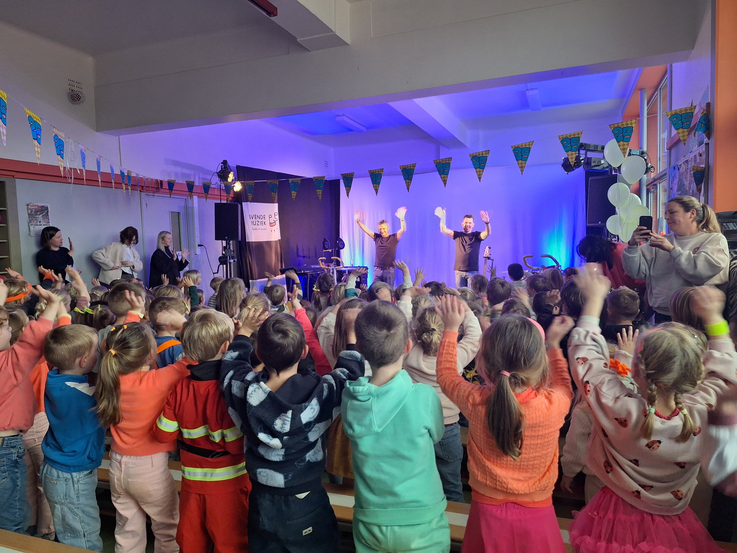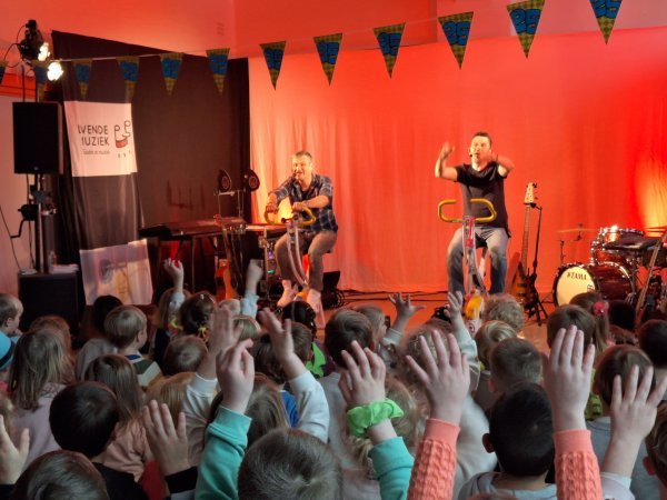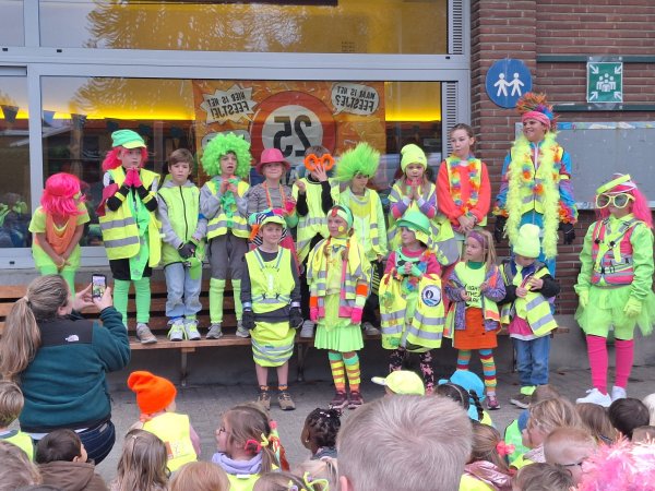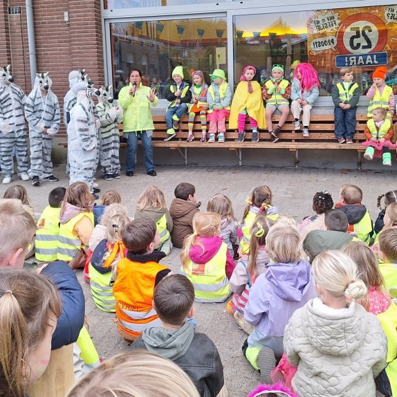 Levende Muziek zorgde voor extra sfeer. Wim en Wouter brachten een speelse en muzikale voorstelling over veilig gedrag in het verkeer. Met grappige en herkenbare liedjes leerden de leerlingen waarom je een fietshelm draagt, je een fluohesje aandoet en natuurlijk niet uit een verkeersbord eet.