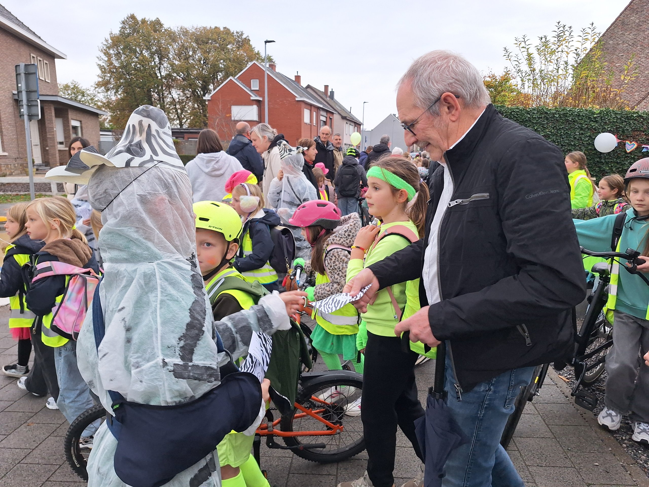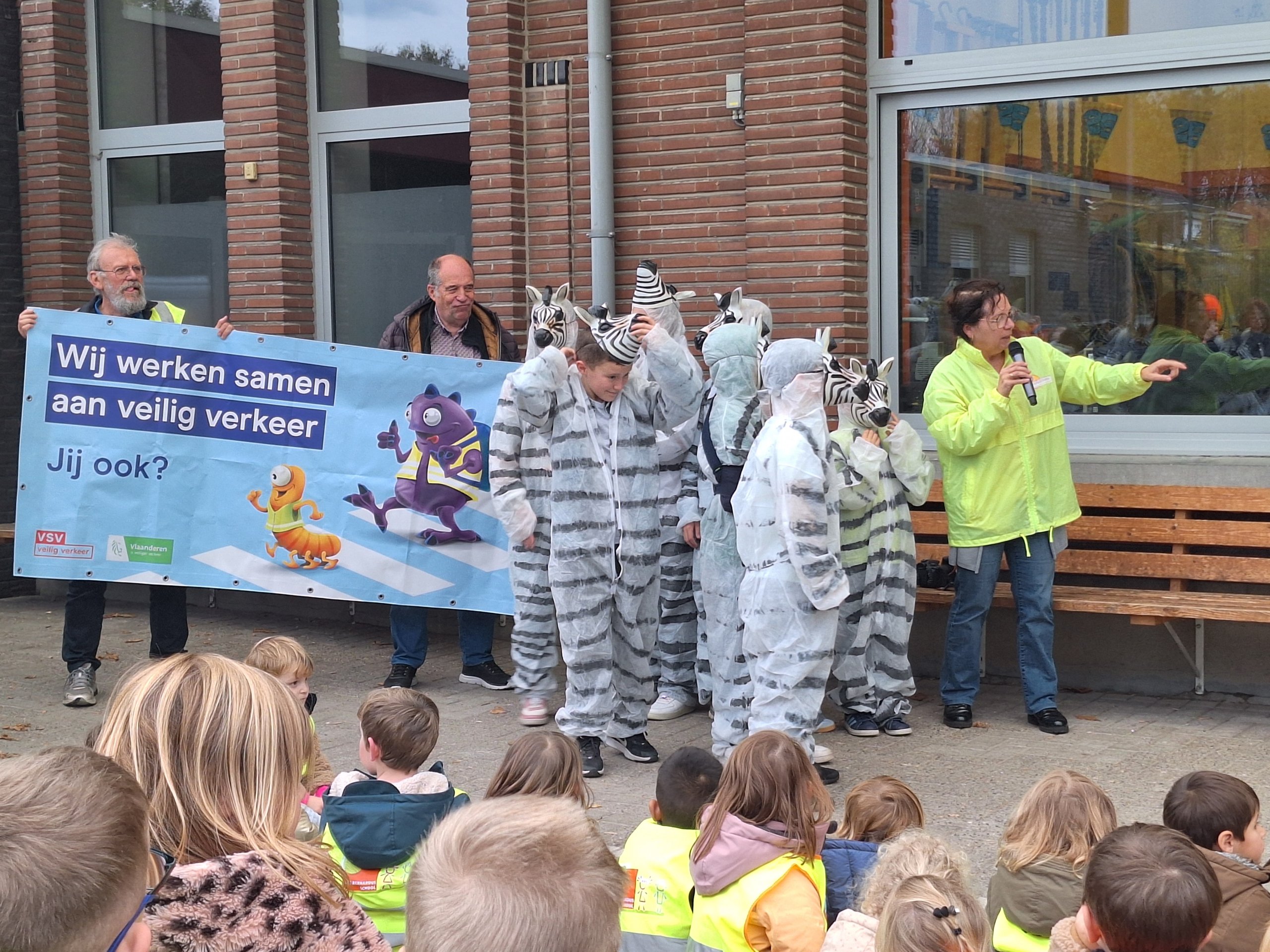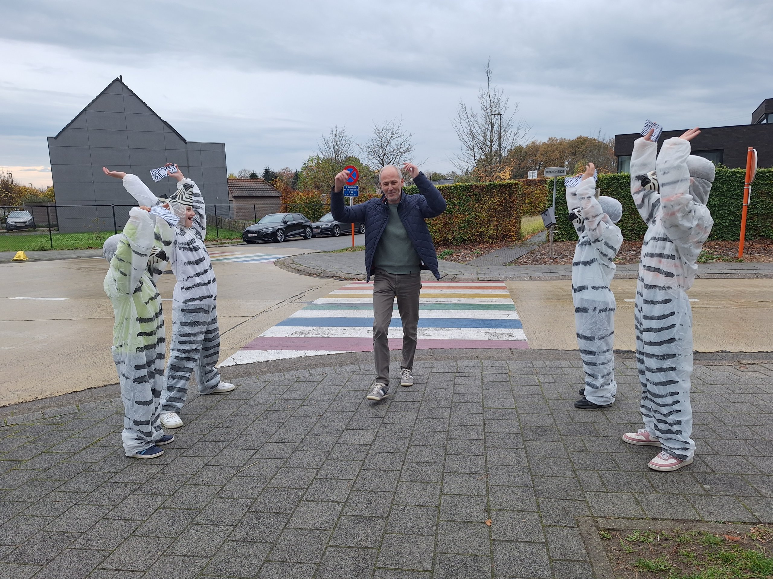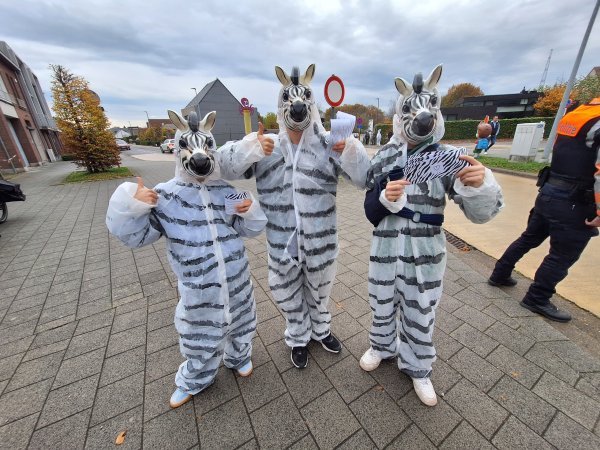 's Ochtens en 's avonds namen enkele leerlingen een bijzondere taak op zich. Verkleed als zebra stonden ze aan het zebrapad om iedereen veilig te begeleiden.