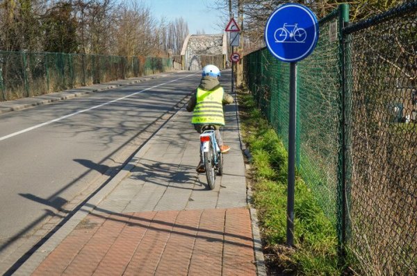 Een fietspad wordt aangegeven met evenwijdige onderbroken witte strepen of met een blauw verkeersbord (D7). Het verkeer dat uit de zijstraat komt, moet jou voorrang geven want jij rijdt op het doorlopende fietspad.
